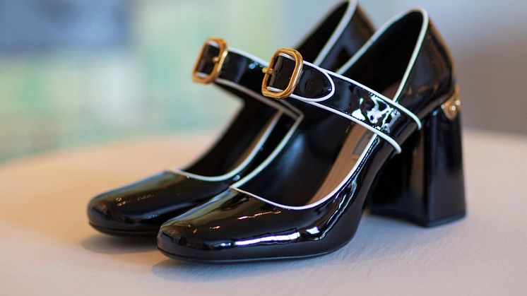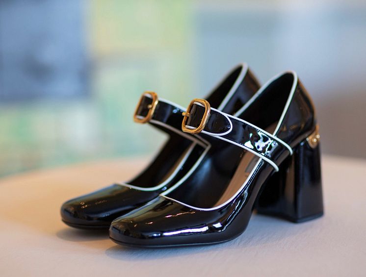 De här skorna bar Sara Danius när hon tillkännagav att Bob Dylan blev Nobelpristagare i litteratur 2016. Svarta lackskor från Prada med vita detaljer och guldfärgat spänne och gulddetalj på klack. Etikett handskriven av Sara Danius tejpad på originalkartongen där det står "Svartvit lack "Dylanskorna" Stockholm 2016". Till auktionen.