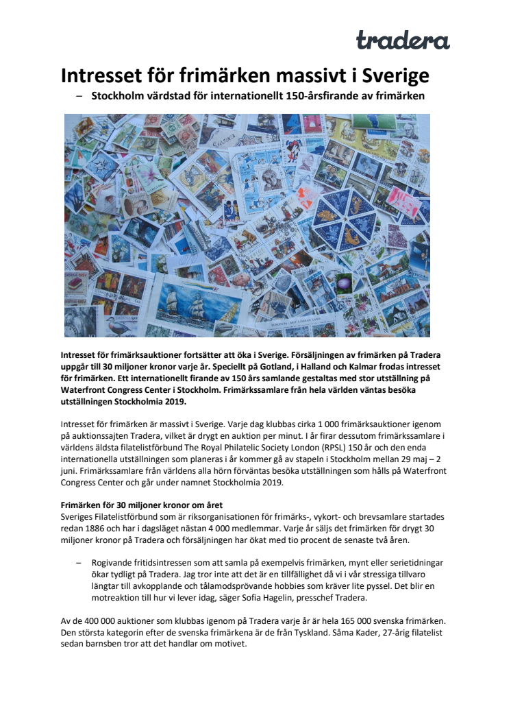 Intresset för frimärken är massivt i Sverige. Varje dag klubbas cirka 1 000 frimärksauktioner igenom på auktionssajten Tradera, vilket är drygt en auktion per minut. I år firar dessutom frimärkssamlare i världens äldsta filatelistförbund The Royal Philatelic Society London (RPSL) 150 år och den enda internationella utställningen som planeras i år kommer gå av stapeln i Stockholm mellan 29 maj – 2 juni. Frimärkssamlare från världens alla hörn förväntas besöka utställningen som hålls på Waterfront Congress Center och går under namnet Stockholmia 2019.