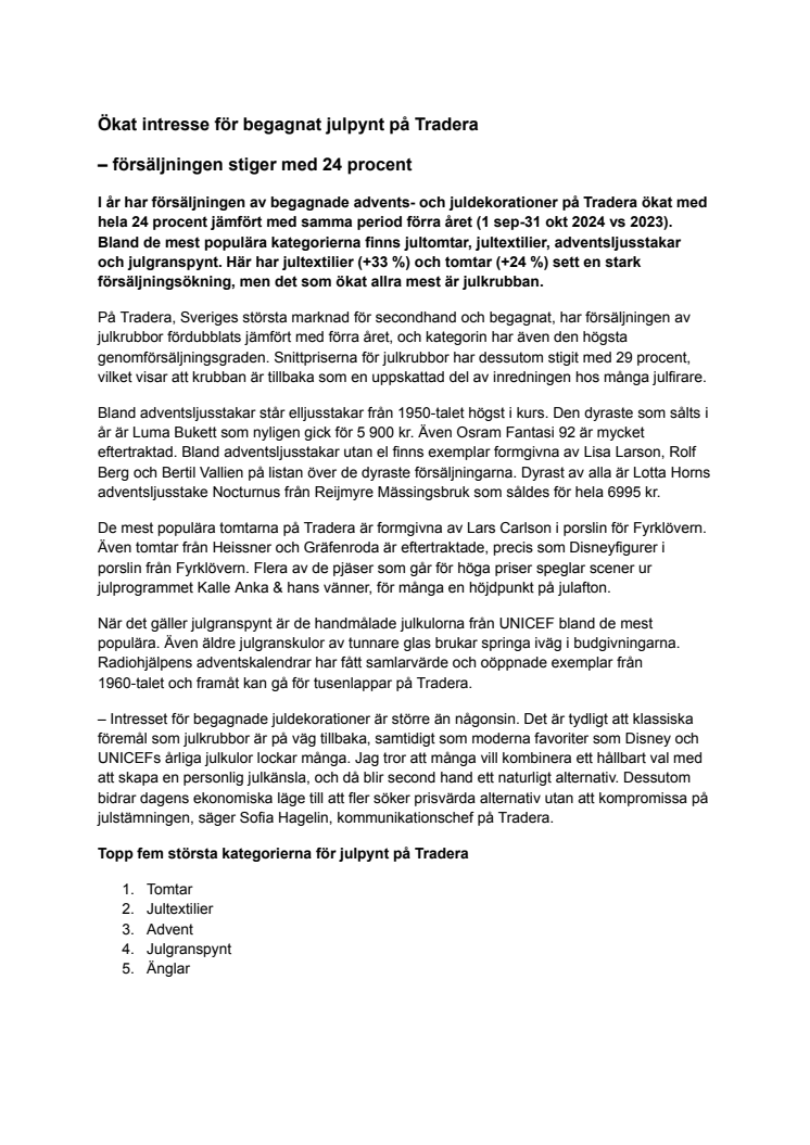 – Intresset för begagnade juldekorationer är större än någonsin. Det är tydligt att klassiska föremål som julkrubbor är på väg tillbaka, samtidigt som moderna favoriter som Disney och UNICEFs årliga julkulor lockar många. Jag tror att många vill kombinera ett hållbart val med att skapa en personlig julkänsla, och då blir second hand ett naturligt alternativ. Dessutom bidrar dagens ekonomiska läge till att fler söker prisvärda alternativ utan att kompromissa på julstämningen, säger Sofia Hagelin, kommunikationschef på Tradera.