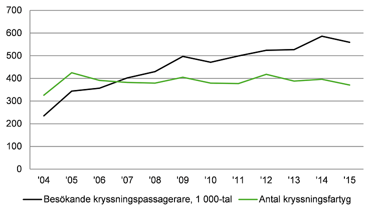 Figur: Antal anlöp med kryssningsfartyg i svenska hamnar och antal besökande kryssningspassagerare i tusental, 2004–2015.