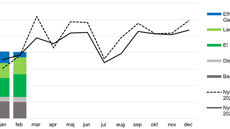 Antalet nyregistrerade lastbilar minskade med 33 procent för de lätta lastbilarna och med 12 procent för de tunga lastbilarna. Detta jämfört med februari 2024. Det är troligtvis effekter av en utdragen lågkonjunktur.