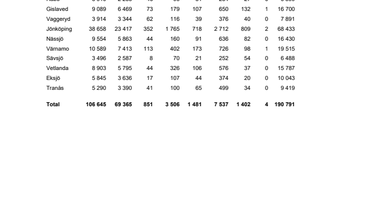 Uppgifterna är hämtade ur Trafikanalys statistik ”Fordon i län och kommuner 2019”. Uppgifter om antalet bilar efter drivmedel för kommuner i Jönköpings län finns i relaterad information.