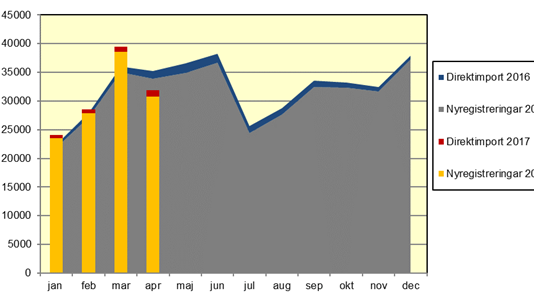 Under april månad 2017 nyregistrerades 31 841 personbilar, en minskning med 9,7 procent jämfört med april månad föregående år. Nedgången kan förklaras med kalendereffekten, då april detta år hade tre färre registreringsdagar än april 2016. Detta beror på att påsken år 2017 inföll i april och föregående år i mars.