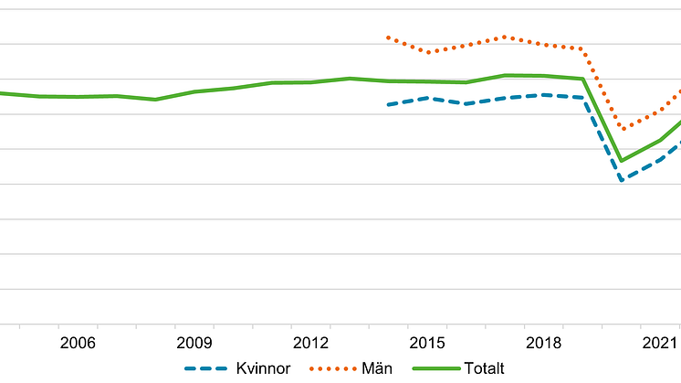 I ett längre perspektiv har det genomsnittliga antalet enkelresor per person med färdtjänsttillstånd legat på en relativt stabil nivå (se figur). Åren efter coronapandemin visar på en återhämtning. Antalet färdtjänsttillstånd per 1 000 invånare är tillbaka till nivåerna före pandemin.