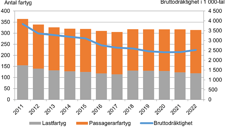 Det var Lastfartygensom minskade i antal medan antal passagerarfartyg i stället ökade något. Antal lastfartyg på minst 100 brutto uppgick till 119, en nettominskning med 4 fartyg. Trots färre lastfartyg ökade totala bruttodräktigheten med 7 procent, vilket främst kan förklaras av ett par nybyggda större rorofartyg. Passagerarfartygens nettoförändring blev i stället +1 i antal och med en marginell ökning i totala bruttodräktigheten jämfört med 2021. Antal passagerarfartyg uppgick 31 december 2022 till 195 fartyg.