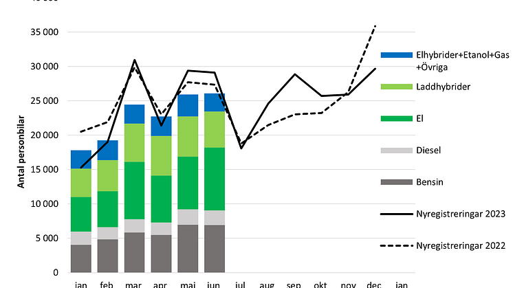 Under juni 2024 nyregistrerades 26 096 personbilar, 10 procent färre än i juni 2023. Av de nyregistrerade bilarna i juni var 35 procent elbilar, jämfört med 38 procent i juni i fjol. Detta visar Trafikanalys officiella statistik om nyregistrerade fordon per månad.