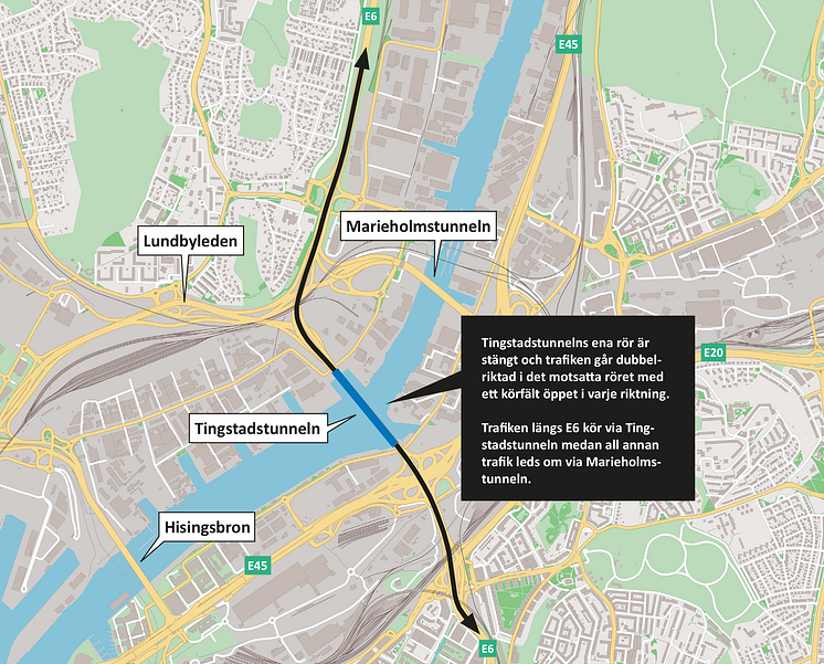 Tingstadstunnelns ena rör är stängt och trafiken går dubbelriktad i det andra