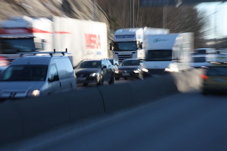 Trafiken på E6 norrut vid Olskroksmotet påverkas på olika sätt beroende på tid på dygnet och om det är vardag eller helg.