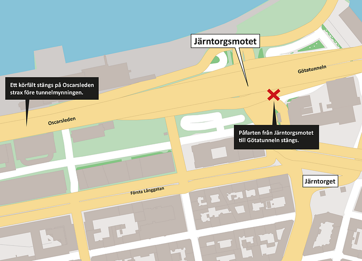 Dessutom stängs påfarten från Järntorgsmotet till Götatunneln och antalet körfält på Oscarsleden begränsas från två till ett strax före tunnelmynningen.