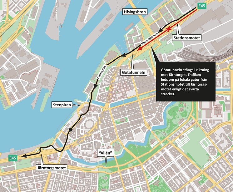 Västlänken ska utföra så kallad cementinjektering i Götatunnelns norra rör för att täta utrymmet mellan berg och det betongvalv som har gjutits i ett tidigare förstärkningsarbete. Detta innebär att Götatunneln – och då även Gullbergstunneln – måste stängas i riktning mot Järntorget under helgerna den 16-18 september, den 30 september-2 oktober, den 7-9 oktober och den 14-16 oktober.