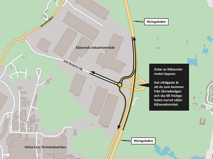 För att underlätta trafiksituationen i korsningen är det viktigt att trafiken från Sörredsvägen till Hisingsleden norrut väljer Kålseredsmotet, som delvis öppnar den 27 februari.