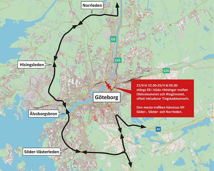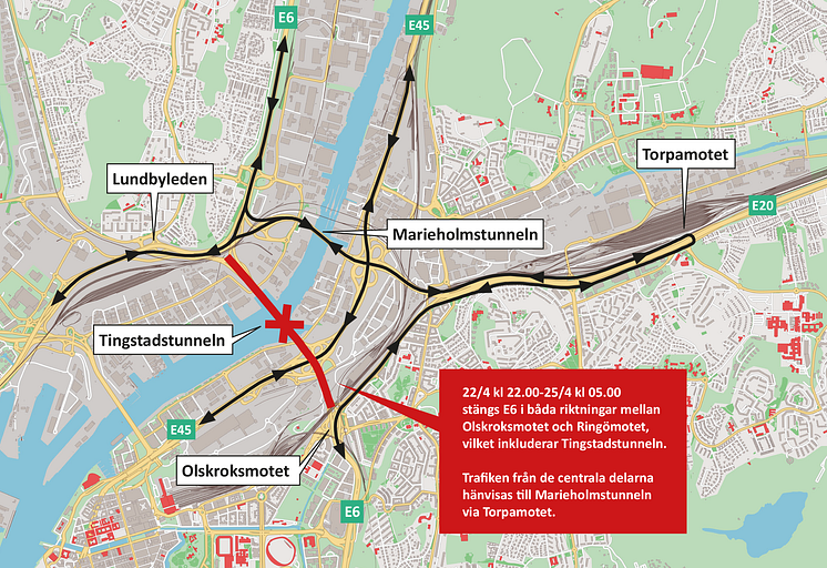 Renoveringen inleds med att Tingstadstunneln och E6 mellan Olskroksmotet och Ringömotet stängs helt från fredagen den 22 april klockan 22.00 till måndagen den 25 april klockan 05.00.
