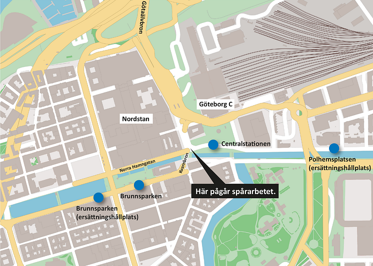 Den 22 maj-11 juni pågår ett spårarbete vid Drottningtorget, som påverkar all kollektivtrafik mellan Brunnsparken och Centralstationen. Resenärer uppmanas att söka sin resa i appen Västtrafik To Go.