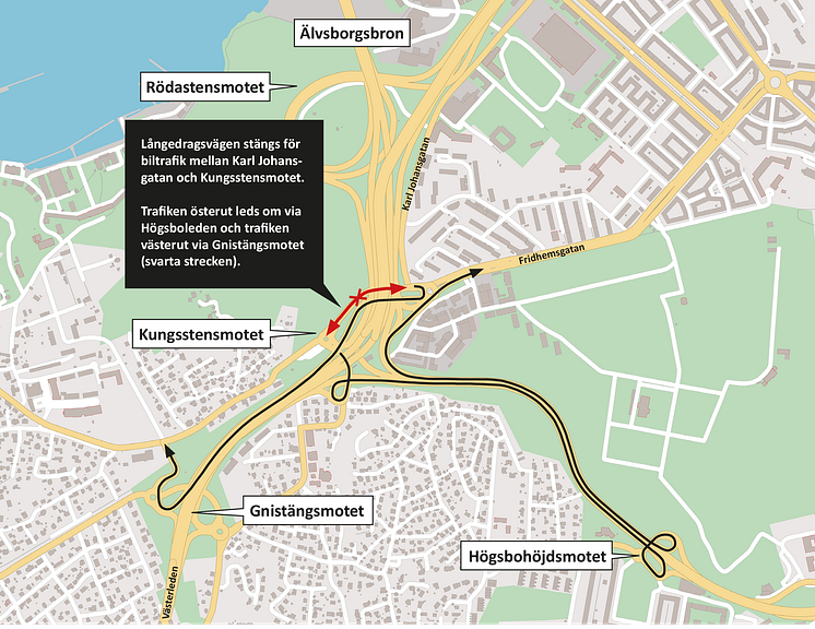 Den 22 februari inleds renoveringen av Kungsstensmotet, som sker i olika etapper fram till december. Den första etappen pågår i åtminstone tre veckor och då stängs Långedragsvägen för fordonstrafik.