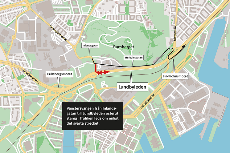 När ombyggnationen av Eriksbergsmotet är klar – vilket väntas bli i slutet av 2024 – stängs alltså korsningen Inlandsgatan-Lundbyleden permanent. Redan den 11 september i år måste dock vänstersvängen från Inlandsgatan till Lundbyleden mot centrum stängas för att motverka köer i Lundbytunneln. Fordonstrafiken leds om via Herkulesgatan och Lindholmsmotet.