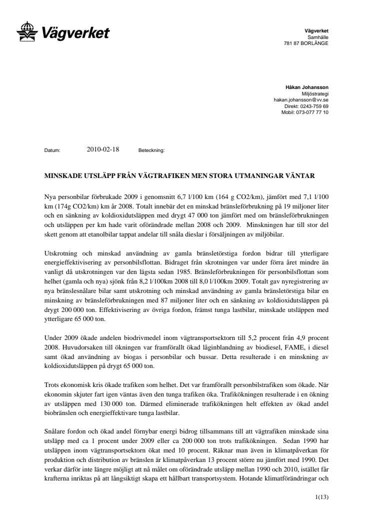 PM från Vägverket - Minskade utsläpp från vägtrafiken men stora utmaningar väntar (PDF-fil, 100 kB)