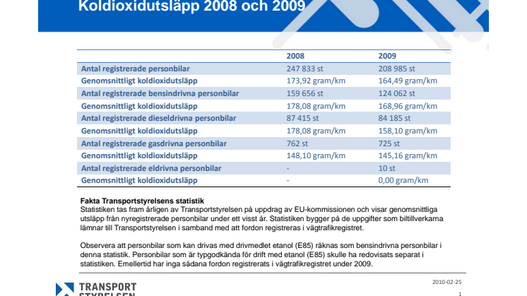 Den svenska fordonsparken fortsätter minska sina koldioxidutsläpp. Det visar statistik från Transportstyrelsen på nya personbilar som lämnas till EU i dagarna.  Minskningen från 174 gram/km till 164 gram/km är den största sedan mätningarna startade år 1978. Huvudorsaken till de minskade utsläppen är att bränsleeffektiva dieselbilar har ersatt etanolbilar i nybilsförsäljningen av miljöbilar.