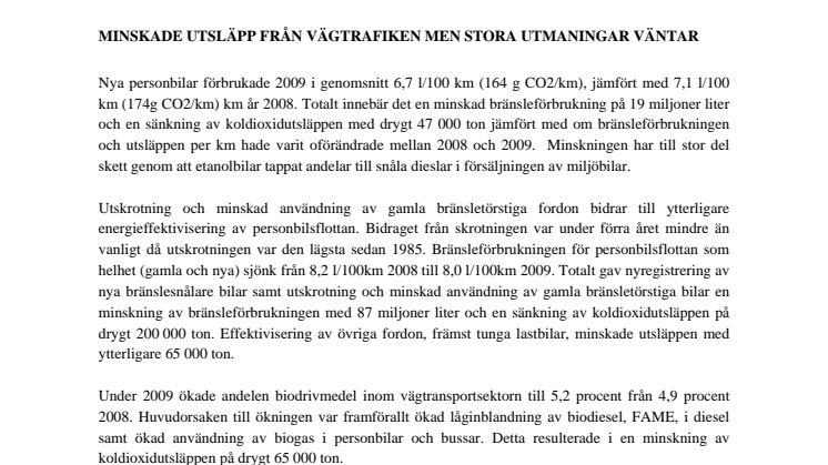 Totalt minskade utsläppen från vägtrafiken i Sverige med 1 procent eller 200 000 ton förra året. Det visar beräkningar av vägtrafikens utsläpp som Vägverket snart kommer lämna till regeringen. Utöver mer energieffektiva personbilar spelade även energieffektivisering av övriga fordon och ökad andel biobränslen in. Detta motverkades till viss del av ökad trafik. Utsläppen ligger idag 10 procent över målet om oförändrade utsläpp mellan 1990 och 2010. Målet kommer därför inte kunna nås.