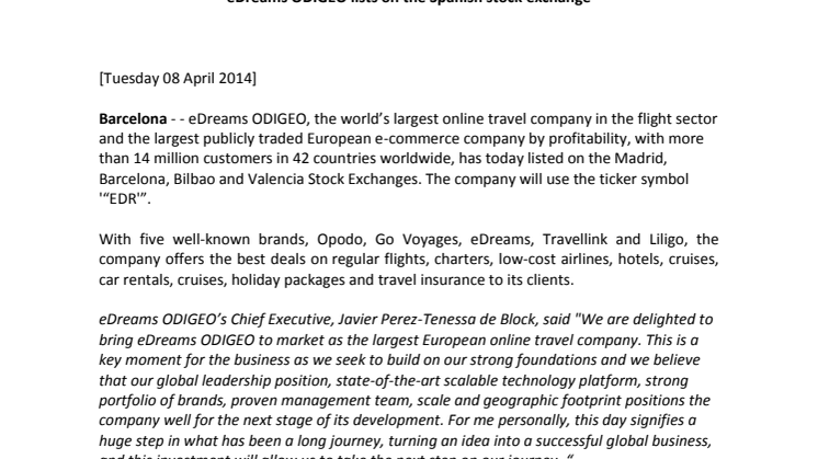 Barcelona - - eDreams ODIGEO, the world’s largest online travel company in the flight sector and the largest publicly traded European e-commerce company by profitability, with more than 14 million customers in 42 countries worldwide, has today listed on the Madrid, Barcelona, Bilbao and Valencia Stock Exchanges. The company will use the ticker symbol '“EDR'”.