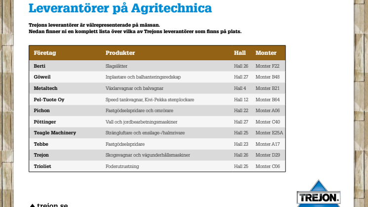 Trejon hälsar dig varmt välkommen till vår monter på Agritechnica. Vi finns i Hall 26, Monter D29 och visar våra produkter inom skogsbruk och vägunderhåll.
