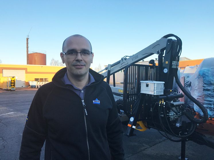 Tomasz Kut framför nya vikkranen V7900 Trejon Multiforest.