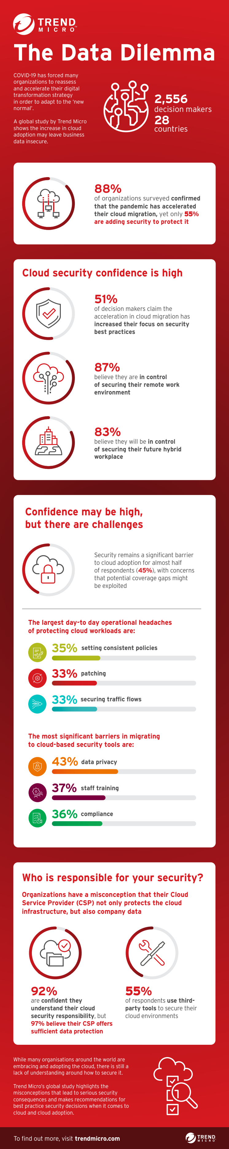 Undersökning från Trend Micro visar att 88 procent av företag världen över har ökat takten på sin molnmigrering, men avslöjar samtidigt att endast 55 procent av företagen investerat i den säkerhet som behövs för en trygg flytt till molnet.