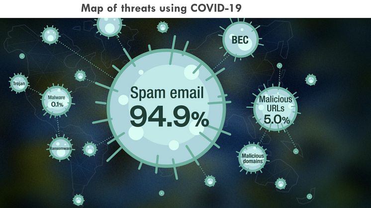 COVID-19 används i en mängd skadliga kampanjer där cyberkriminella använder sig av såväl skräpmail, VD-mail, skadlig programvara, kidnappningsprogram som skadliga domäner. I takt med att antalet drabbade av det dödliga viruset fortsätter att växa, ökar också cyberkriminellas försök att utnyttja människors behov av information om Covid19 genom attacker relaterade till viruset.