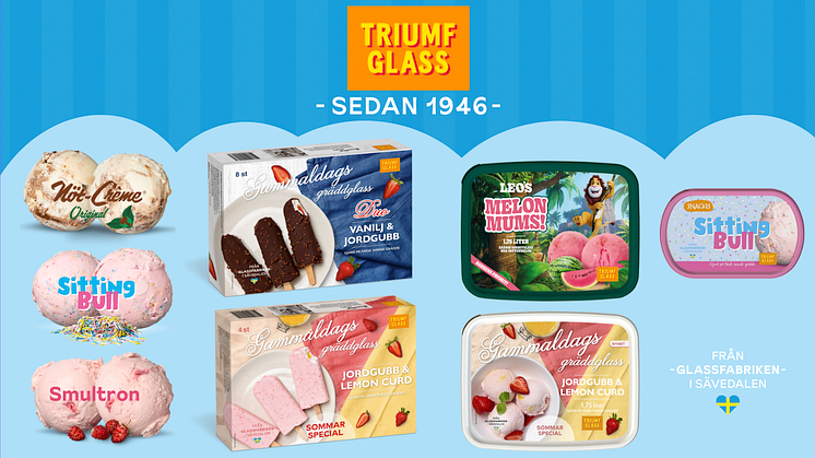 Glassnyheter från Triumf Glass. Somriga smaker så som Smultron och Gammaldags Gräddglass Sommarspecial Jordgubb & Lemon curd. Klassiska smaker så som Sitting Bull och Nöt Créme i nya format.