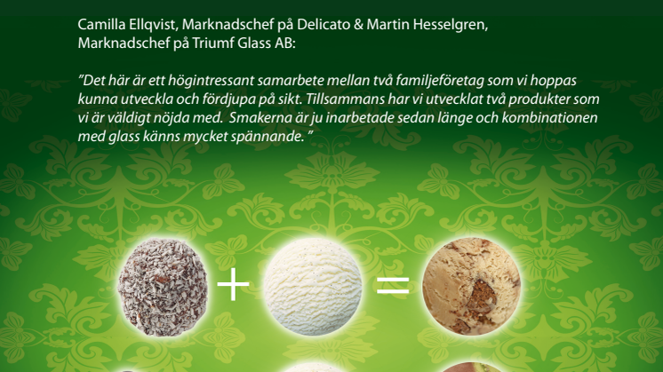 Triumf Glass AB och Delicato AB startar inför säsongen 2011 upp ett spännande samarbete! Tillsammans har vi utvecklat två fantastiskt goda och innovativa glassnyheter. Storsäljarna från Delicatos sortiment, den välkända Delicatobollen och Dammsugaren får i år sällskap av Triumf Glass lena gräddglass.