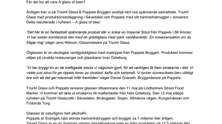 Äntligen kan vi på Triumf Glass & Poppels Bryggeri avslöja vårt nya spännande samarbete. Triumf Glass med produktionsanläggning i Sävedalen och Poppels med sitt hantverksbryggeri i Jonsered. Detta resulterade i nyheten – A glass of beer.