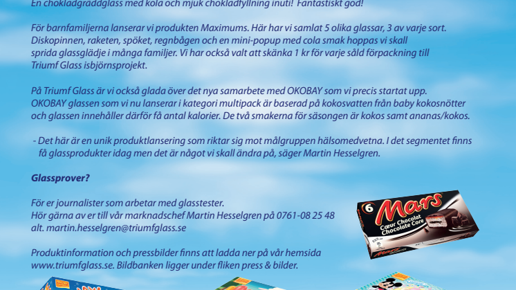 För barnfamiljerna lanserar vi produkten Maximums. Här har vi samlat 5 olika glassar, 3 av varje sort. Diskopinnen, raketen, spöket, regnbågen och en mini-popup med cola smak hoppas vi sprider glassglädje i många familjer. Vi har också valt att skänka 1 kr för varje såld förpackning till Triumf Glass isbjörnsprojekt.