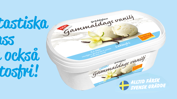 Allt fler efterfrågar laktosfria mejeriprodukter. Därför lanserar Triumf Glass nu sin bästsäljande gräddglass Gammaldags Vanilj som 0,5 liter laktosfri. Glassen smakar precis lika gott och innehåller samma ingredienser som originalet. Finns att köpa i butik från vecka 39.
