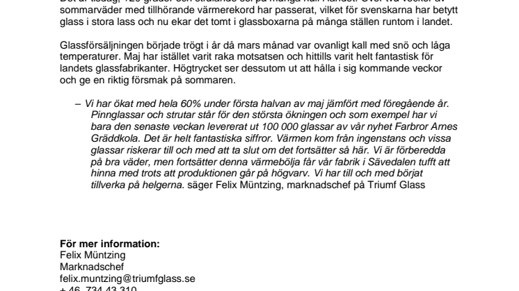 – Vi har ökat med hela 60% under första halvan av maj jämfört med föregående år. Pinnglassar och strutar står för den största ökningen och som exempel har vi bara den senaste veckan levererat ut 100 000 glassar av vår nyhet Farbror Arnes Gräddkola. Det är helt fantastiska siffror. Värmen kom från ingenstans och vissa glassar riskerar till och med att ta slut om det fortsätter så här. Vi är förberedda på bra väder, men fortsätter denna värmebölja får vår fabrik i Sävedalen tufft att hinna med trots att produktionen går på högvarv. Vi har till och med börjat tillverka på helgerna. säger Felix Müntzing, marknadschef på Triumf Glass