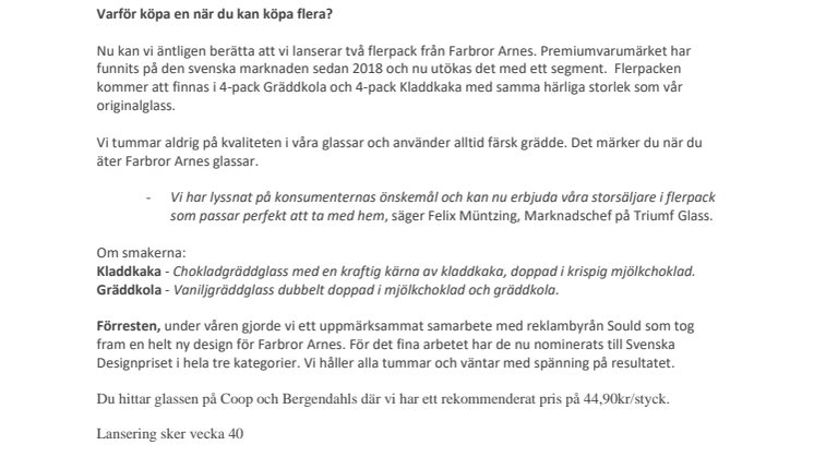 Nu kan vi äntligen berätta att vi lanserar två flerpack från Farbror Arnes. Premiumvarumärket har funnits på den svenska marknaden sedan 2018 och nu utökas det med ett segment. Flerpacken kommer att finnas i 4-pack Gräddkola och 4-pack Kladdkaka med samma härliga storlek som vår originalglass. Vi tummar aldrig på kvaliteten i våra glassar och använder alltid färsk grädde. Det märker du när du äter Farbror Arnes glassar.