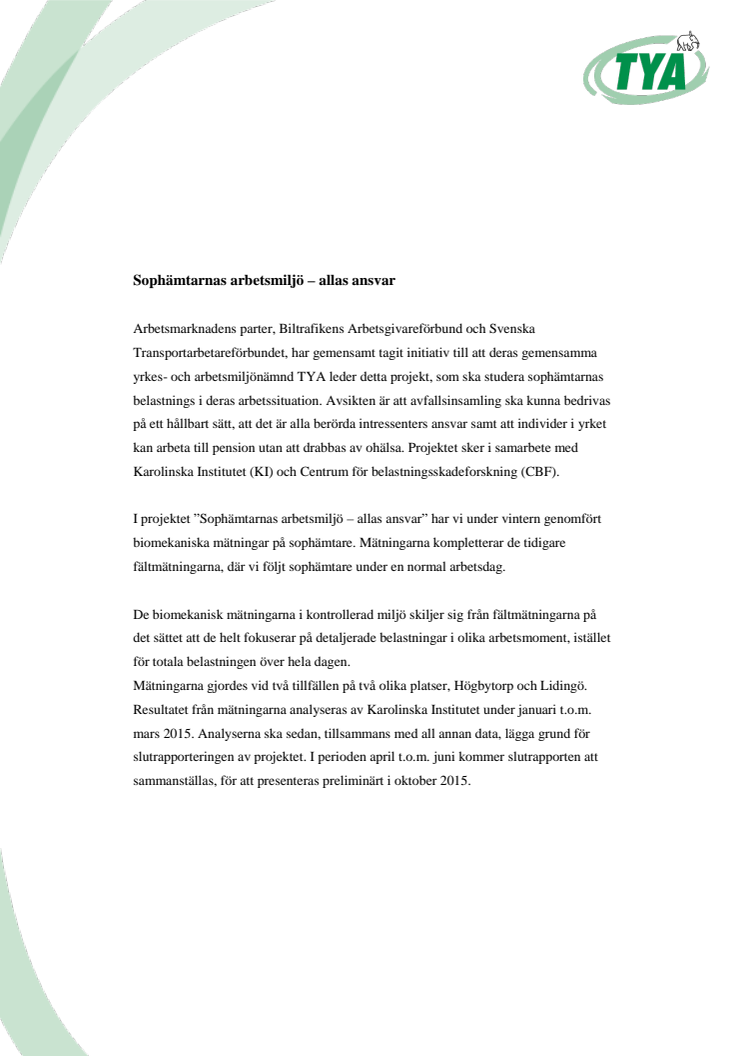 Läs mer om TYA-projektet som ska studera sophämtarnas belastning i deras arbete. Projektet sker i samarbete med Karolinska Institutet (KI) och Centrum för belastningsskadeforskning (CBF).