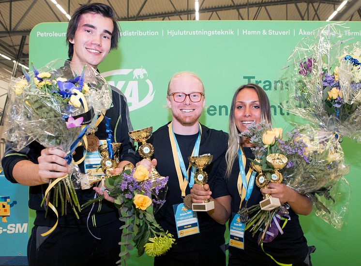 Vinnare David Petersson på prisutdelningen tillsammans med Levis Skagerström Vestrin (t v) och Maritza Erlandsson (t h).