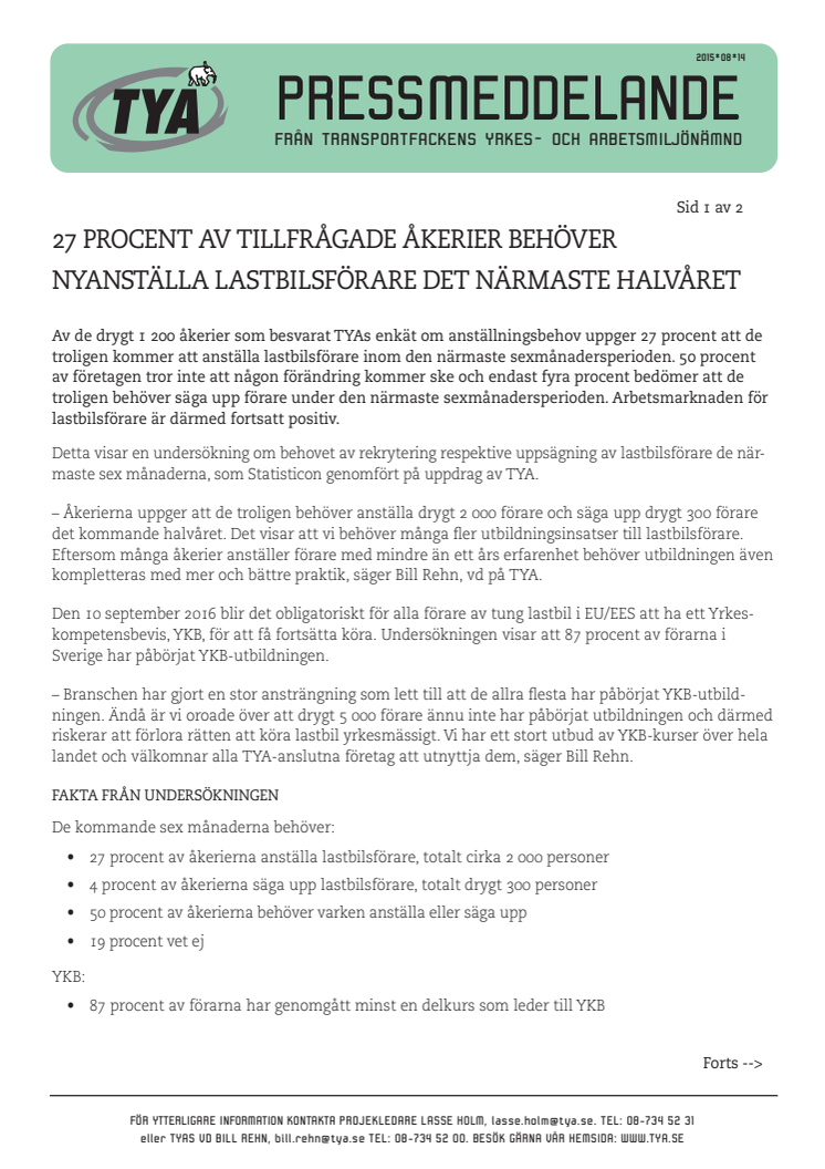 För mer information, kontakta Bill Rehn, vd på TYA, tfn: 08-734 52 20 eller Lasse Holm, projektledare på TYA, tfn: 08-734 52 31. Hämta rapporten, TYAs Trendindikator Rekrytering, på www.tya.se.