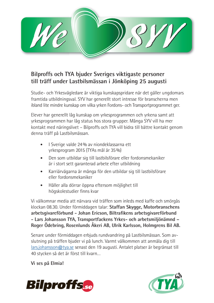 Vi välkomnar media att närvara vid träffen som inleds med kaffe och smörgås klockan 08.30. Under förmiddagen talar: Staffan Skygge, Motorbranschens arbetsgivareförbund - Johan Ericson, Biltrafikens arbetsgivareförbund - Lars Johansson TYA, Transportfackens Yrkes- och arbetsmiljönämnd – Roger Ödebring, Rosenlunds Åkeri AB, Ulrik Karlsson, Holmgrens Bil AB.