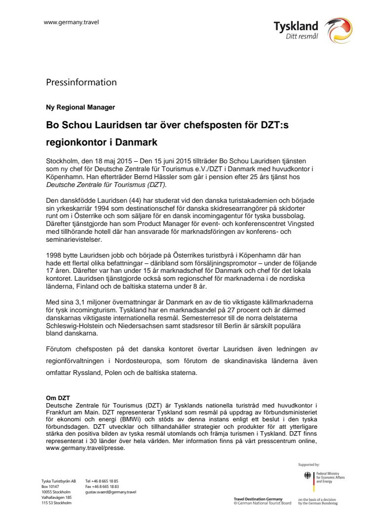 Den 15 juni 2015 tillträder Bo Schou Lauridsen tjänsten som ny chef för Deutsche Zentrale für Tourismus e.V./DZT i Danmark med huvudkontor i Köpenhamn. Han efterträder Bernd Hässler som går i pension efter 25 års tjänst hos Deutsche Zentrale für Tourismus (DZT).