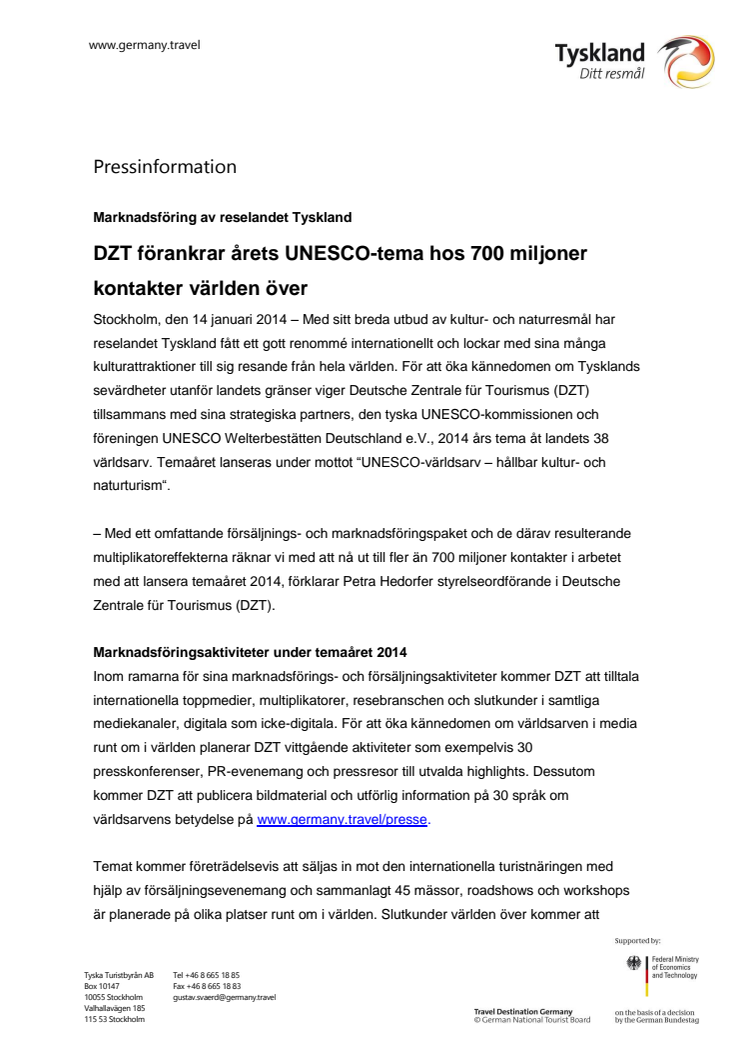 Med sitt breda utbud av kultur- och naturresmål har reselandet Tyskland fått ett gott renommé internationellt och lockar resande från hela världen med sina många kulturattraktioner. För att ytterligare öka kännedomen om Tysklands sevärdheter viger DZT tillsammans med den tyska UNESCO-kommissionen och föreningen UNESCO Welterbestätten Deutschland e.V. 2014 års tema åt landets 38 världsarv.