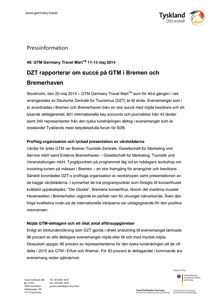 GTM Germany Travel Mart som för 40:e gången i rad arrangerades av Deutsche Zentrale für Tourismus är till ända. Evenemanget som i år anordnades i Bremen och Bremerhaven blev en stor succé med många och nöjda besökare. 601 internationella key accounts och journalister från 43 länder samt 340 representanter från den tyska turistnäringen deltog i reselandet Tysklands mest betydelsefulla B2B-forum.