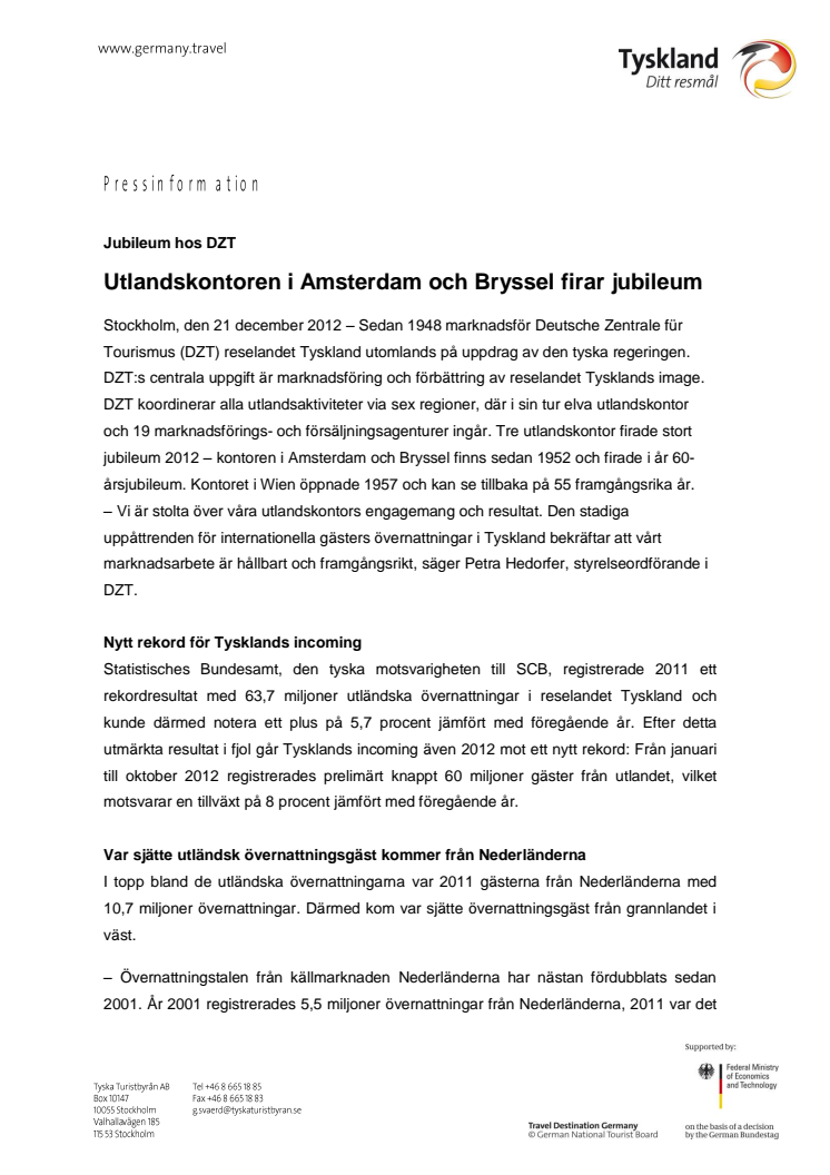 Sedan 1948 marknadsför Deutsche Zentrale für Tourismus (DZT) reselandet Tyskland utomlands på uppdrag av den tyska regeringen. DZT koordinerar alla utlandsaktiviteter via sex regioner, där i sin tur elva utlandskontor och 19 försäljningsagenturer ingår. Tre utlandskontor firade stort jubileum 2012 – kontoren i Amsterdam och Bryssel firade 60-årsjubileum och kontoret i Wien 55 år.