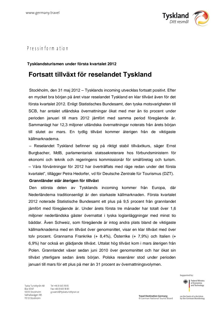 Tysklands incoming har utvecklats fortsatt positivt under årets första kvartal. Enligt Statistisches Bundesamt har antalet utländska övernattningar ökat med mer än tio procent jämfört med samma period föregående år.