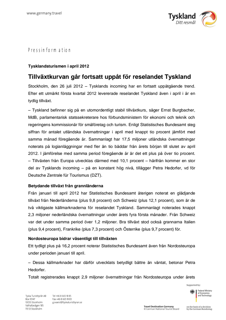 Tysklands incoming har en fortsatt uppåtgående trend. Efter ett utmärkt första kvartal 2012 levererade reselandet Tyskland en tydlig tillväxt även i april i år.