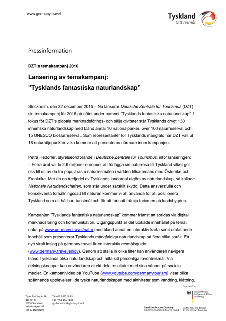 Nu lanserar Deutsche Zentrale für Tourismus (DZT) sin temakampanj för 2016 på nätet under namnet ”Tysklands fantastiska naturlandskap”. I fokus för DZT:s globala marknadsförings- och säljaktiviteter står Tysklands drygt 130 inhemska naturlandskap med bland annat 16 nationalparker, över 100 naturreservat och 15 UNESCO biosfärreservat. DZT har valt ut 16 naturhöjdpunkter att representera dessa.
