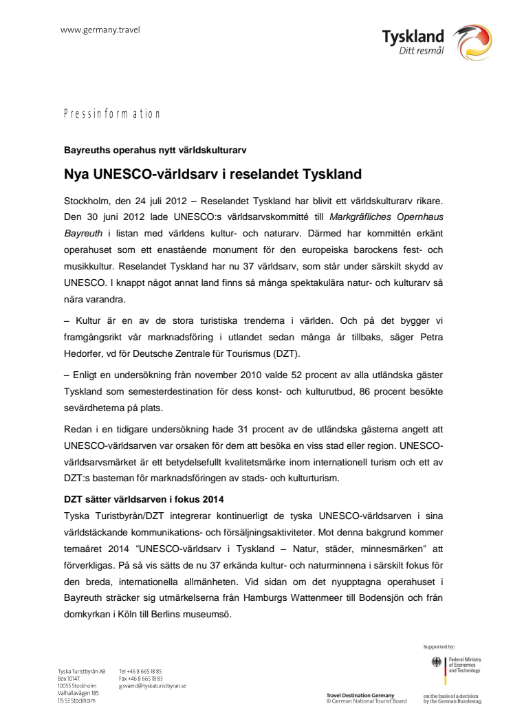 Reselandet Tyskland har blivit ett världskulturarv rikare. Den 30 juni 2012 lade UNESCO:s världsarvskommitté till Markgräfliches Opernhaus Bayreuth i listan med världens kultur- och naturarv. Därmed har kommittén erkänt operahuset som ett enastående monument för den europeiska barockens fest- och musikkultur. Reselandet Tyskland har nu 37 världsarv som står under särskilt skydd av UNESCO.