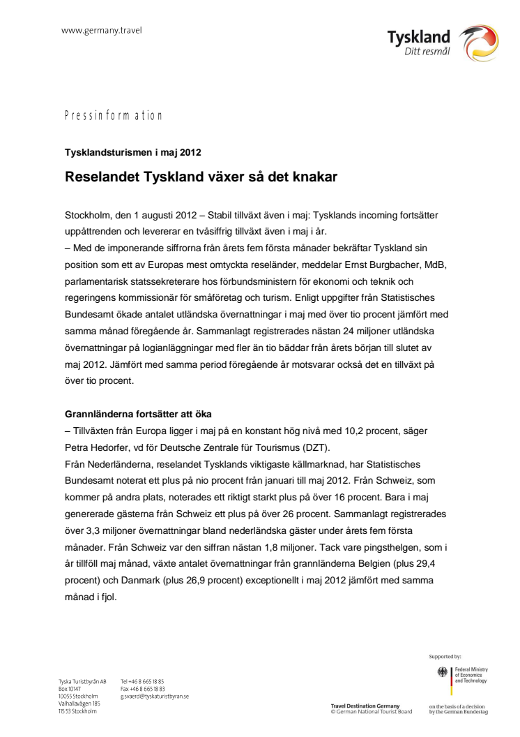 – Med de imponerande siffrorna från årets fem första månader bekräftar Tyskland sin position som ett av Europas mest omtyckta reseländer, meddelar Ernst Burgbacher, MdB, parlamentarisk statssekreterare hos förbundsministern för ekonomi och teknik och regeringens kommissionär för småföretag och turism.