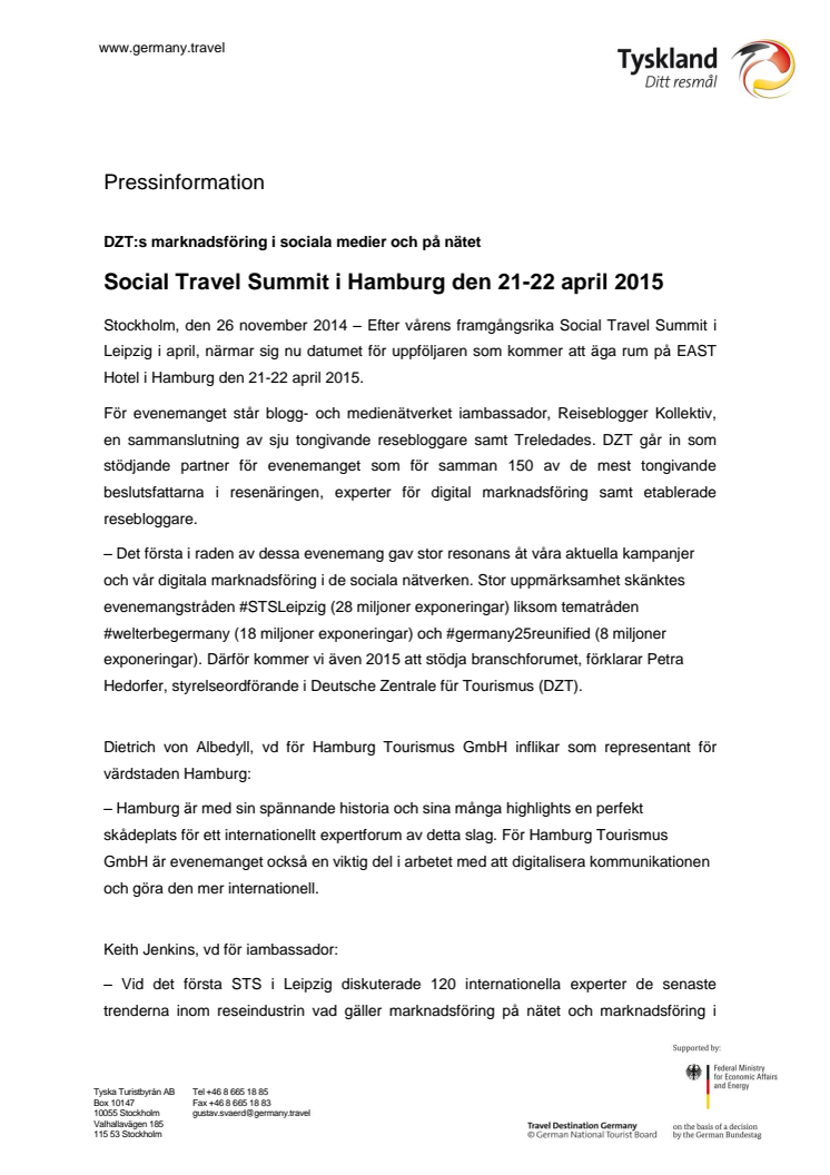 Efter vårens framgångsrika Social Travel Summit i Leipzig, närmar sig nu uppföljaren som kommer att äga rum på EAST Hotel i Hamburg i april 2015. För evenemanget står blogg- och medienätverket iambassador, Reiseblogger Kollektiv, sju tongivande resebloggare samt Treledades. DZT är partner för evenemanget som för samman 150 beslutsfattare från resenäring, digital marknadsföring och resebloggare.