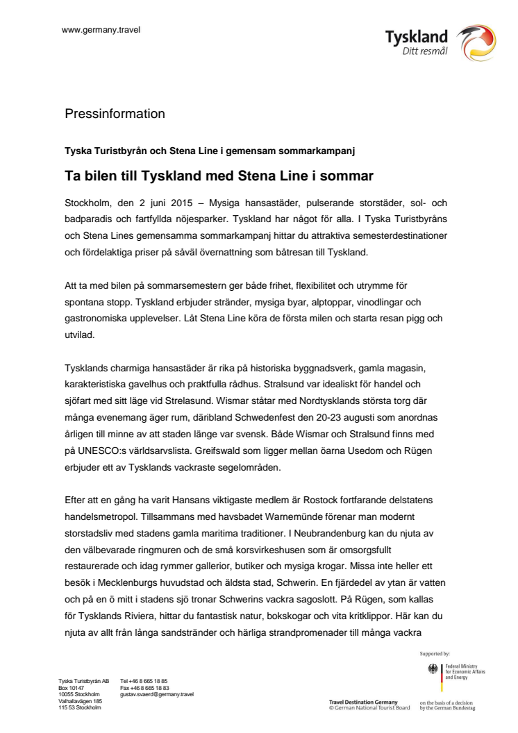 Mysiga hansastäder, pulserande storstäder, sol- och badparadis och fartfyllda nöjesparker. Tyskland har något för alla. I Tyska Turistbyråns och Stena Lines gemensamma sommarkampanj hittar du attraktiva semesterdestinationer och fördelaktiga priser på såväl övernattning som båtresan till Tyskland.