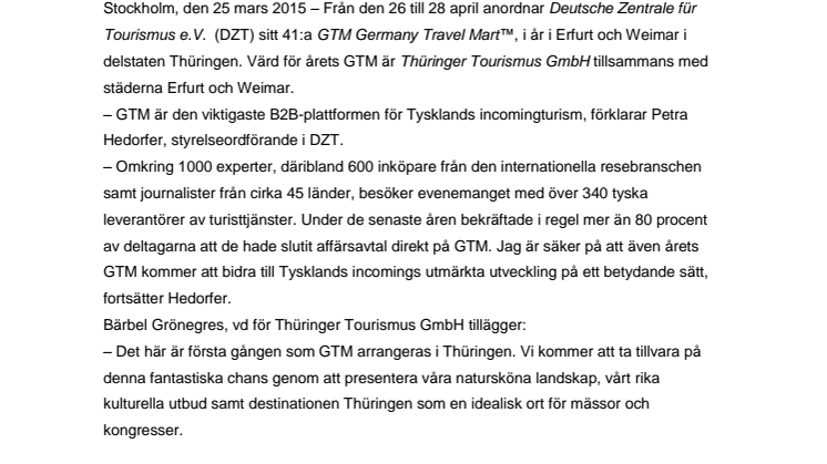 Från den 26 till 28 april anordnar Deutsche Zentrale für Tourismus e.V. (DZT) sitt 41:a GTM Germany Travel Mart™, i år i Erfurt och Weimar i delstaten Thüringen. Värd för årets GTM är Thüringer Tourismus GmbH tillsammans med städerna Erfurt och Weimar.